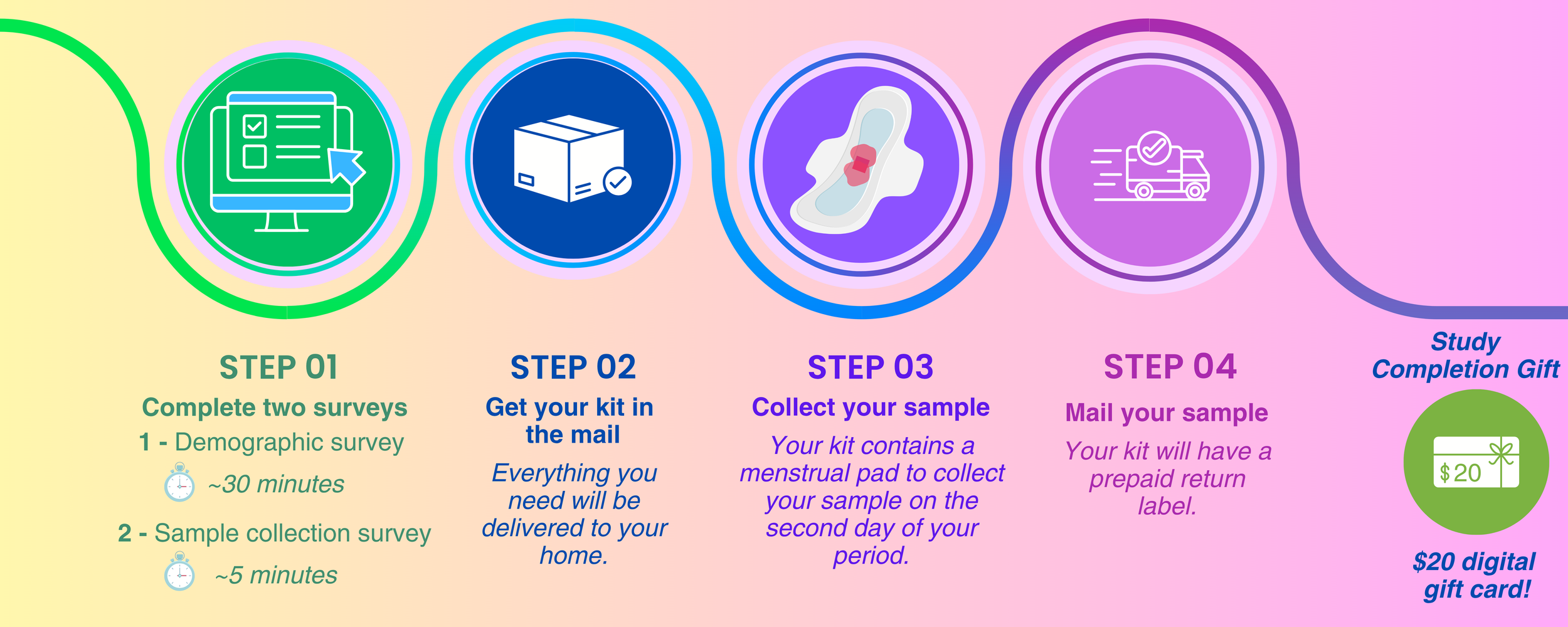 Your sample will be processed in our lab to study patterns in epigenetics (like DNA methylation). We combine your data with others to explore how menstrual health varies across individuals.